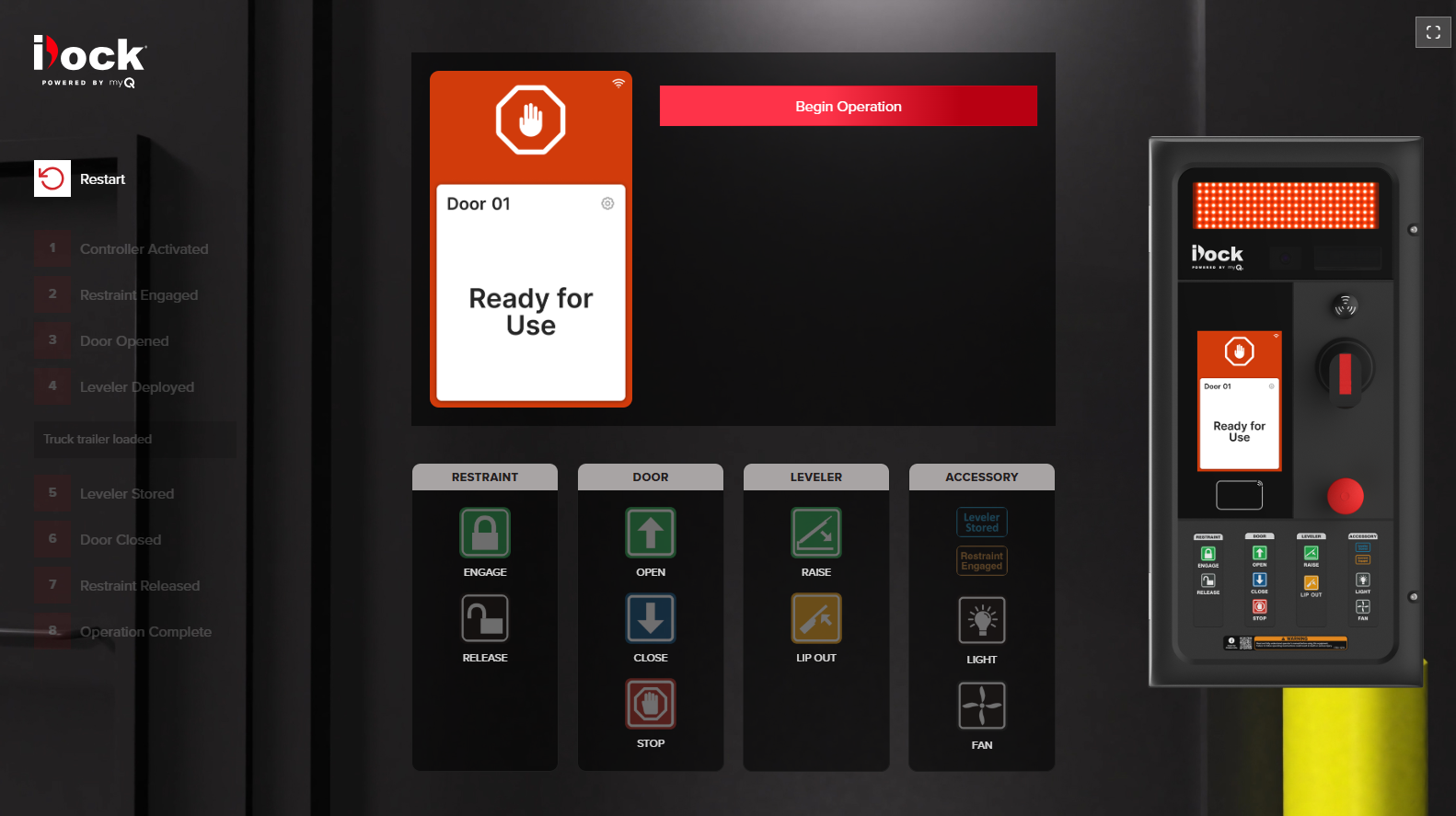 But iDock 2.0 goes far beyond visual guidance-it connects your dock to the future. With WiFi and cellular connectivity, the controller stays online at all times, enabling smart two-way communication with the cloud. An integrated interior camera adds a new layer of accountability, capturing operator activity and product flow, while full support for the myQ ecosystem of sensors brings every door, levelers, and restraint into one centralized platform. The result is a system that doesn't just manage the dock-it elevates it, turning a point of risk into a hub of safety, visibility, and intelligence.